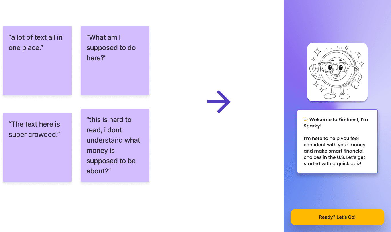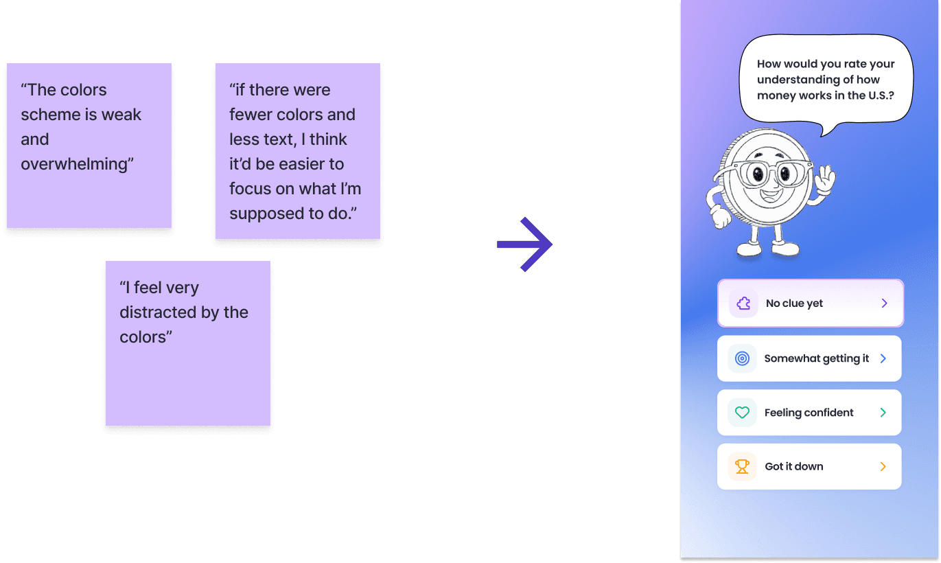 Participants described the interface as friendly and approachable, which validated our mascot and conversational tone. At the same time, the visuals felt “distracting,” so we opted for less colors in our palette.