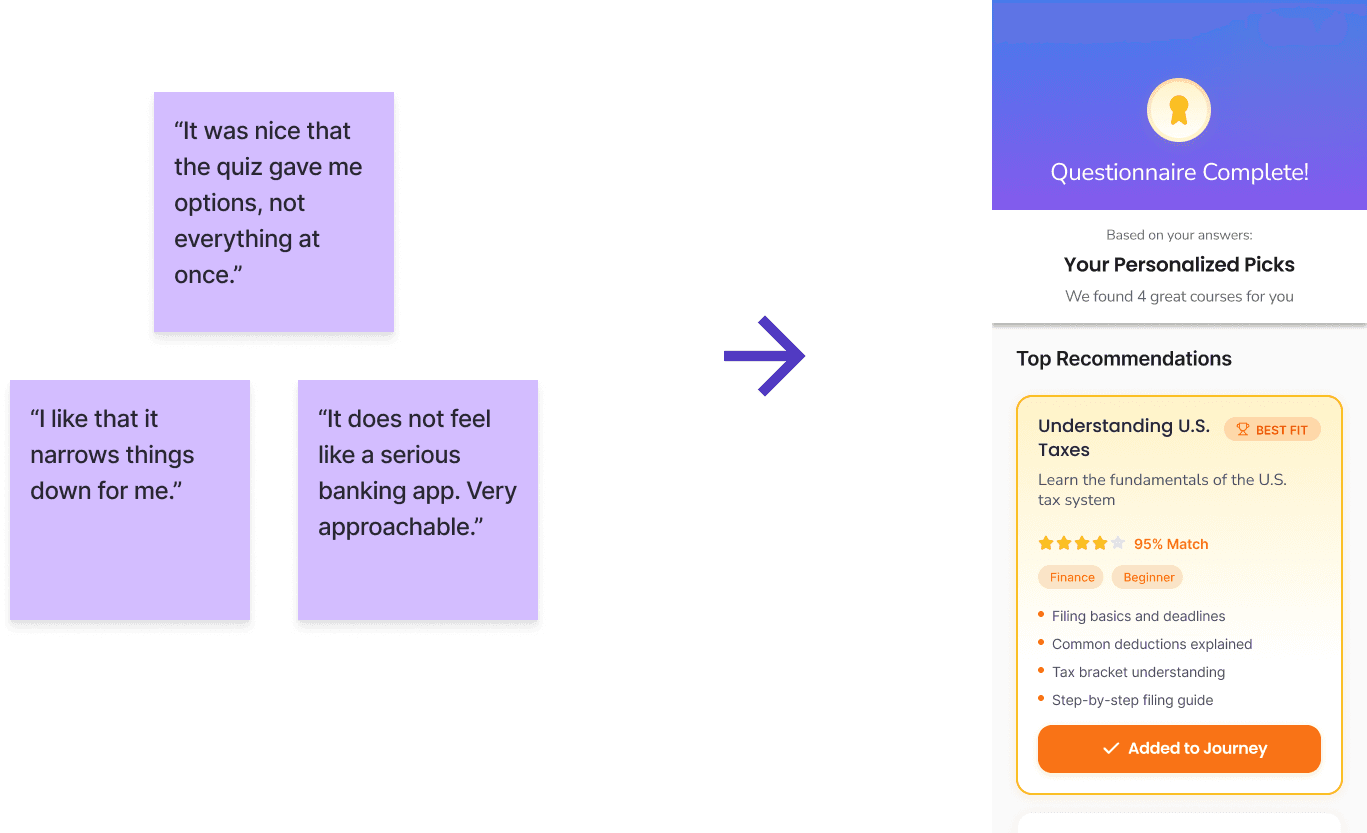 Participants responded well to getting a tailored set of options instead of being dropped into “everything at once,” which told us to keep personalization as a main element of our design.