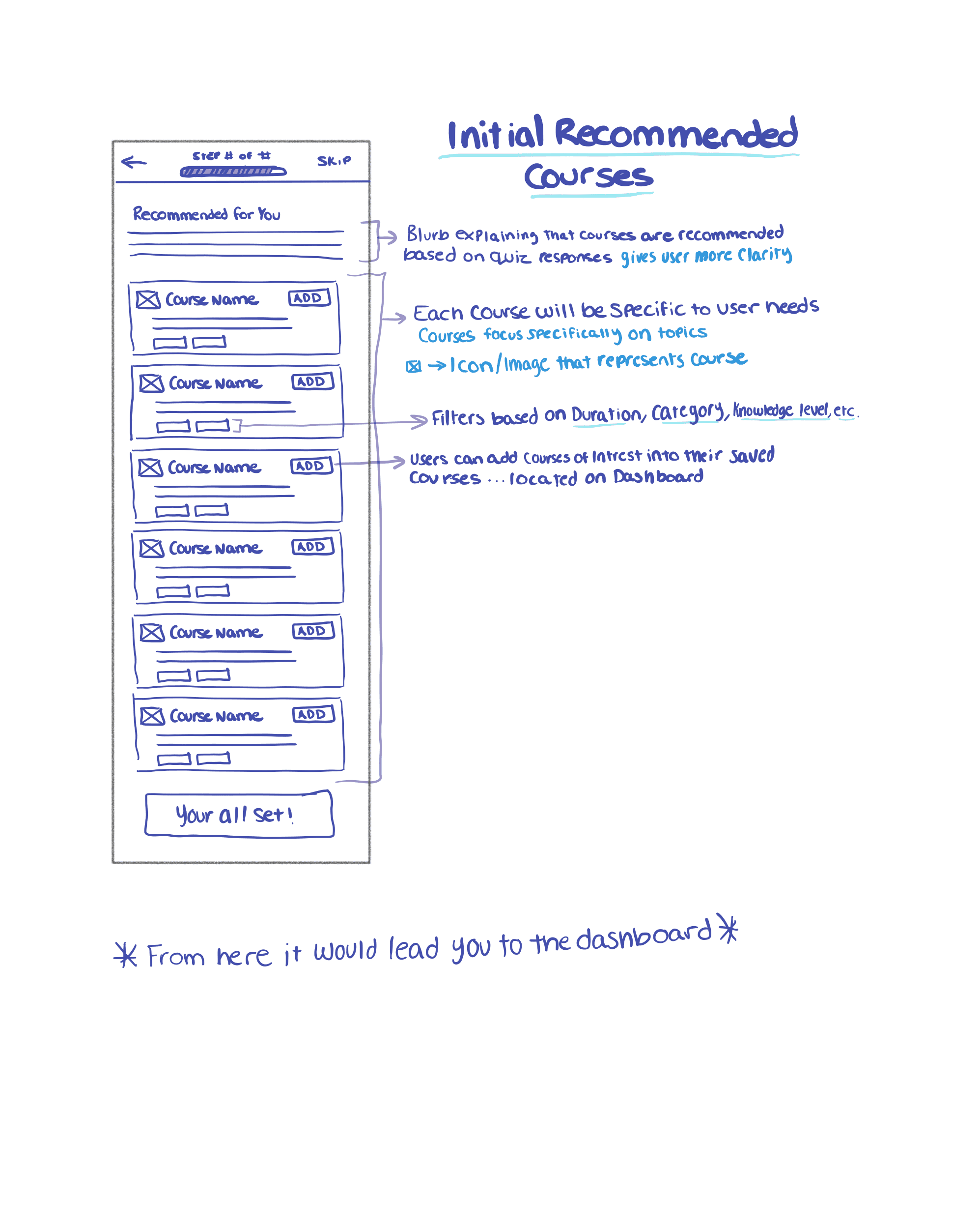 Because of our time constraints, we kept the course content in low fidelity as a placeholder for future iterations and I focused my mid-fidelity work on the personalized onboarding flow, since onboarding would shape everything a user saw next in their learning path.