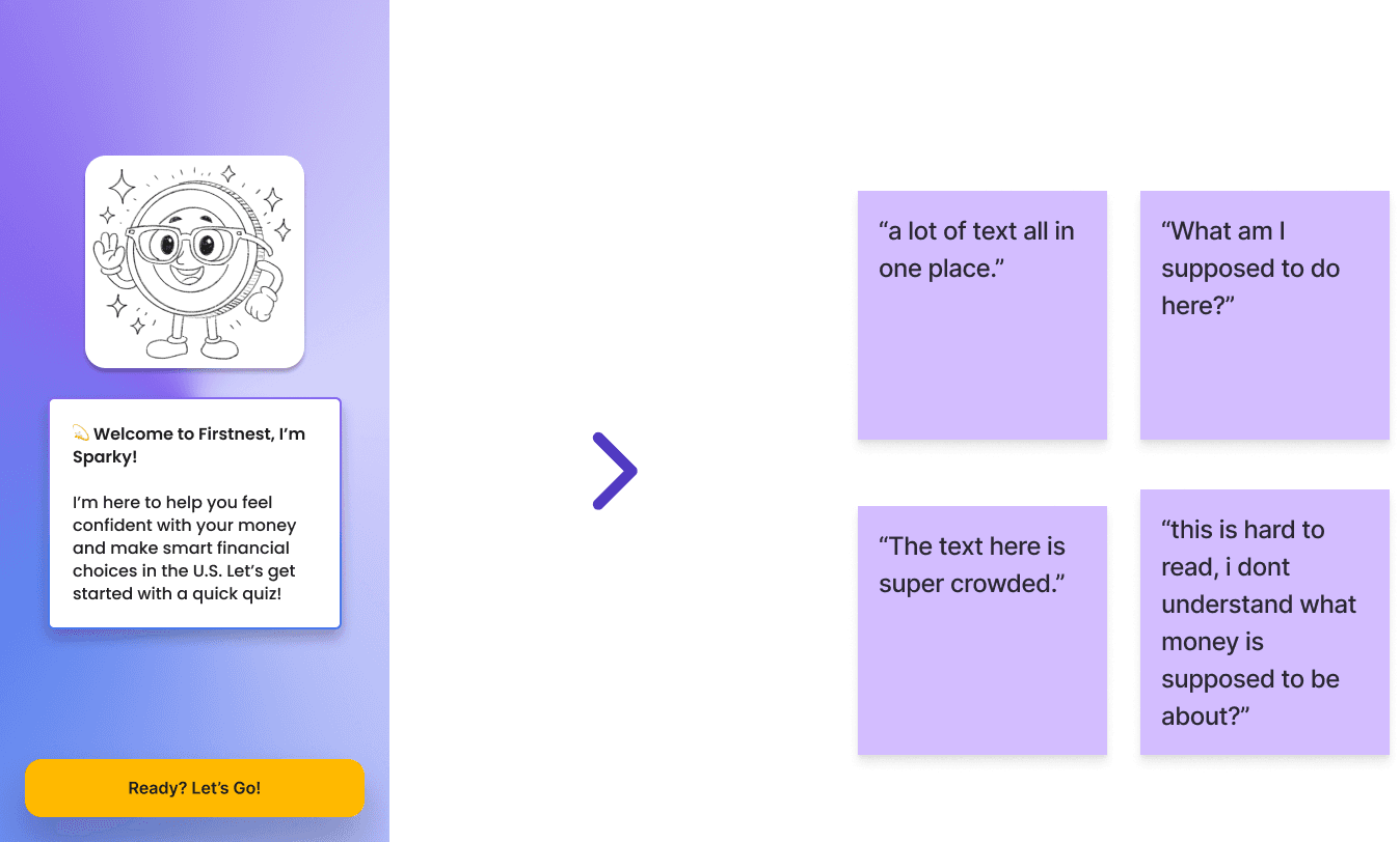 Participants described the interface as friendly and approachable, which validated our mascot and conversational tone. At the same time, the visuals felt “distracting,” so we opted for less colors in our palette for the final design.